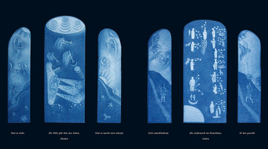 To znaczy, że po otrzymaniu impulsu natchnienia przez początkowe postacie lwa i byka, zawsze przechodzi on w poprzek z południowej strony na północną i z północnej na południową, tak że w wielkiej sali spotykamy kolejno po stronie północnej pokusę arymaniczną, w północnym zielonym oknie i po stronie południowej pokusę Lucyfera. W miarę upływu czasu, ścieżki ponownie się krzyżują, tworząc coraz bardziej kaduceusz. W miarę jak człowiek podąża wzdłuż tej ego osi struktury z zachodu na wschód, te dwie siły coraz bardziej się przenikają. Nie chodzi tu bowiem o dawne misteria, w których drogi były oddzielne, lecz o nowe misteria, w których na przełomie czasu drogi te zostały splecione, tak że dwojaki świat tworzy teraz drogę wyznaczoną przez oś zachód-wschód. Tak więc w kolejnych dwóch [niebieskich] oknach widzimy obszary kosmosu, które są dla nas zamknięte przez Lucyfera i Arymana. Świat czasu jest dla nas zamknięty przez Lucyfera, ten świat, przez który człowiek został stworzony z elementu czasu. Świat kosmosu w sensie duchowym ukryty jest przed nami przez Arymana, gdzie faktycznie pokazane jest, jak człowiek jako mikrokosmos nosi w sobie wszystkie siły makrokosmosu.